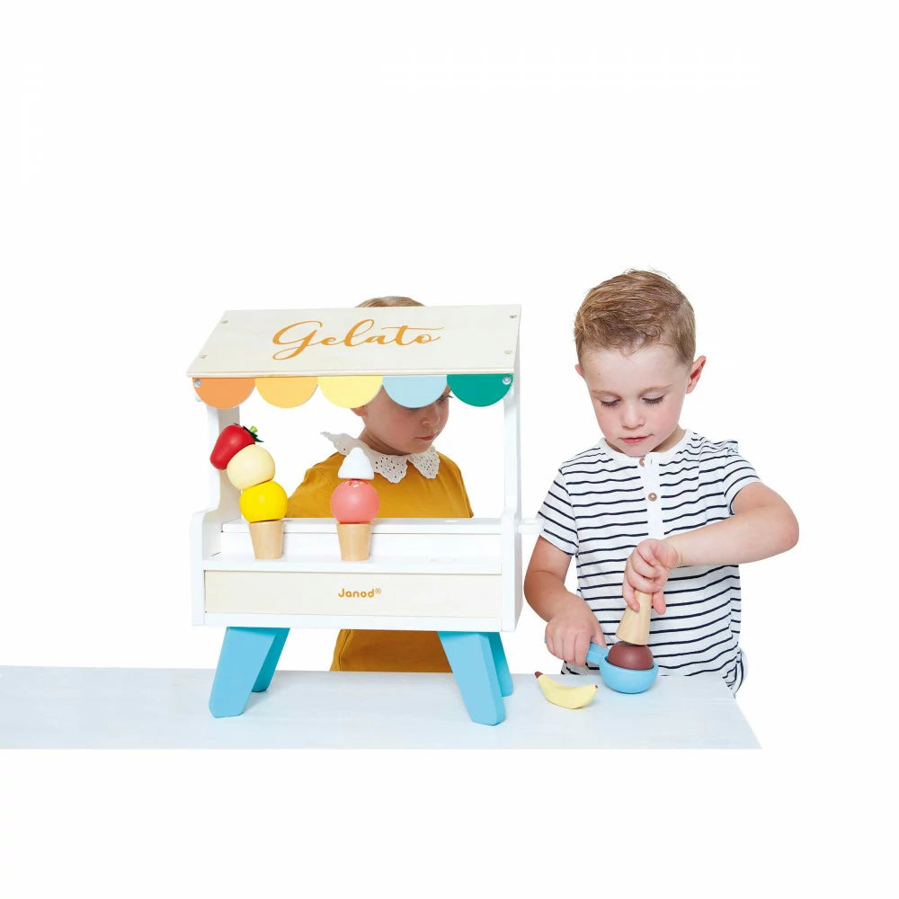 你喜欢香草还是草莓口味的冰淇淋蛋筒?快来这款木制冰淇淋摊,尝遍所有口味!这款清爽的过家家玩具非常适合3岁及以上儿童,非常适合用来围坐在美味的冰淇淋蛋筒旁玩耍。它包含了所有美食家所需的一切:3个蛋筒、6勺不同颜色的冰淇淋,以及水果和鲜奶油,进一步激发孩子们的想象力!为了实用起见,它总共包含14个磁性配件:这样蛋筒上的任何东西都不会掉下来。更巧妙的是:提供的勺子也带有磁性,方便我们的小摊主轻松舀取冰淇淋!顾客吃饱后,可以将勺子挂在摊位的侧面。除了6个用于展示即食冰淇淋的插槽外,摊位背面还有一个储物格。在这个木制摊位上,小朋友们可以扮演冰淇淋摊主,模仿大人们的卖冰淇淋,一定会让全家都乐在其中!这款迷你支架可以轻松摆放在桌子上,鼓励小朋友们分享:每个人都能找到自己喜欢的!这款与食物相关的角色扮演玩具还能激发小朋友们的想象力:如果草莓冰淇淋真的尝起来像泡泡糖会怎么样?孩子们还需要小心地堆叠积木,发挥创造力,打造出最诱人的组合。所有配件均随支架提供,所有配件均采用 FSC® 木材制成。